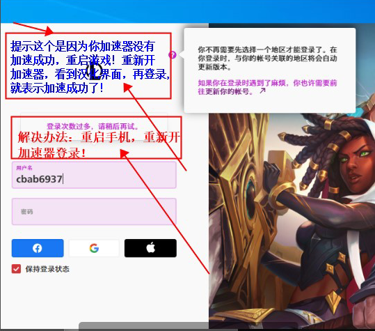 ### 登陆不上,仔细看下面教程!!!登陆不上,看下面教程!!! ### 一定要看:登陆的时候不要开加速器,登陆上后再开加速器 ### 一定要看:提示下面图片的这个,重新登录账号就好了 ### 仔细看下面图片,登陆不上的解决方法,本页涵盖了所有你会遇到的出错的图,自己对应图解决问题即可。。 下面还有一些账号登录常见错误: ### 1、未找到网络、网络无法连接: ### 这种情况请关闭游戏后,开启加速器加速器美测服(LOLPBE),再打开游戏。  ### 2、无法进行安装:安装目录和安装包所在目录都不能有中文  ### 3、下载速度过慢:请关闭加速器后下载,会快很多,网速是会波动的,耐心等待即可   ### 4、您的账号匹配不上我们系统的账号信息:请仔细检查账号密码是否输入正确,密码是区分大小写的,请认真输入  ### 5、显示服务器代理有问题:需要关闭游戏、开启加速器加速器美测服,再开启游戏登录  ### 6、无法连接到验证服务器: 是这个客户端的问题,新版的客户端都不是这个登录界面了,请重新下载安装  ### 7、汉化的时候加那一段字符前未加空格,建议你直接用加速器一键汉化,不要随意改设置,容易造成各种出错  ### 8、网络问题,可以等一下,或者开加速器后开游戏:  ### 9、同意条款,滑动右边滑条,点左边按钮,没汉化就是英语的,依然是滑动滑条点左边    ### 仔细看下面解决方法  ### 很重要:提示这个重新登录账号,加速器里切换节点就好了,很多人都会提示这个,所以看清楚解决方法。安装路径不要有中文。   ### 提示下面这个图,打开文件夹 拖到桌面双击就行了  ### 安装的文件夹不要有中文,检查没有中文,关闭加速器切换加速器节点,都可以解决!选这个启动游戏,不要选红色的  账号 密码错误 提示有箭头的那个  ### 解决方法: 首先关闭加速器登录比较好登录 检查账号密码是不是输入错了 用快捷键( 复制 Ctrl+C 粘贴 Ctrl+V )复制粘贴 账号和密码即可 不用手打(注意密码会不会有什么符号,或者有没有多空格) ### 加速器问题  ### 解决方法:开加速器加速 美测试服 如果开了还是一样就是加速器没效果 换节点或者加速器在尝试 ### 解决方法:加速器的问题 ,先关掉加速器在登陆,上去后在开加速器  ### 排队情况没办法解决,由于官方刚更新,用户太多了,使用加速器,切换加速器节点,其他没有任何办法能解决,只能等待 ### 为什么登陆上去没有游戏选择 ### 从这个 L 图标打开游戏 不要从红色的那个图标打开游戏  ### 预期之外的错误  ### 解决方法:开加速器,如果开了还是不行就换个加速器,uu加速器容易出现这个问题 ### 如果是显示这个界面的 都是过时的版本 需要重新下才行  ### ### 解决方法: 开加速器 加速游戏 ,如果还是没效果的话 删掉游戏用游戏方法1 下载  缺少 D3X9 文件 ### 下这个文件去替换 即可解决:https://wwa.lanzoui.com/iJdOxr3h3yj 看完文档还是解决不了的,请进群 ## 大家可以进QQ群。。有技术处理售后