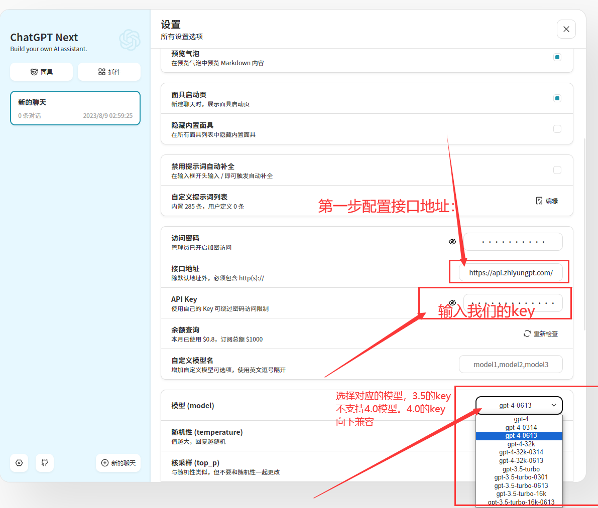 ## 第一步下载gpt客户端并安装地址:https://bingfan.lanzoue.com/b01ffivta 下载密码:1234,下载安装后按教程填写接口地址跟key,就可以!        ## 第二步:配置接口地址跟key: ### 在接口地址填入:https://api.zhiyungpt.com ## API KEY:输入你从我这里购买的key,以sk-开头的那段  ## 第三步:开始提问使用  ## 自由选择模型设置: