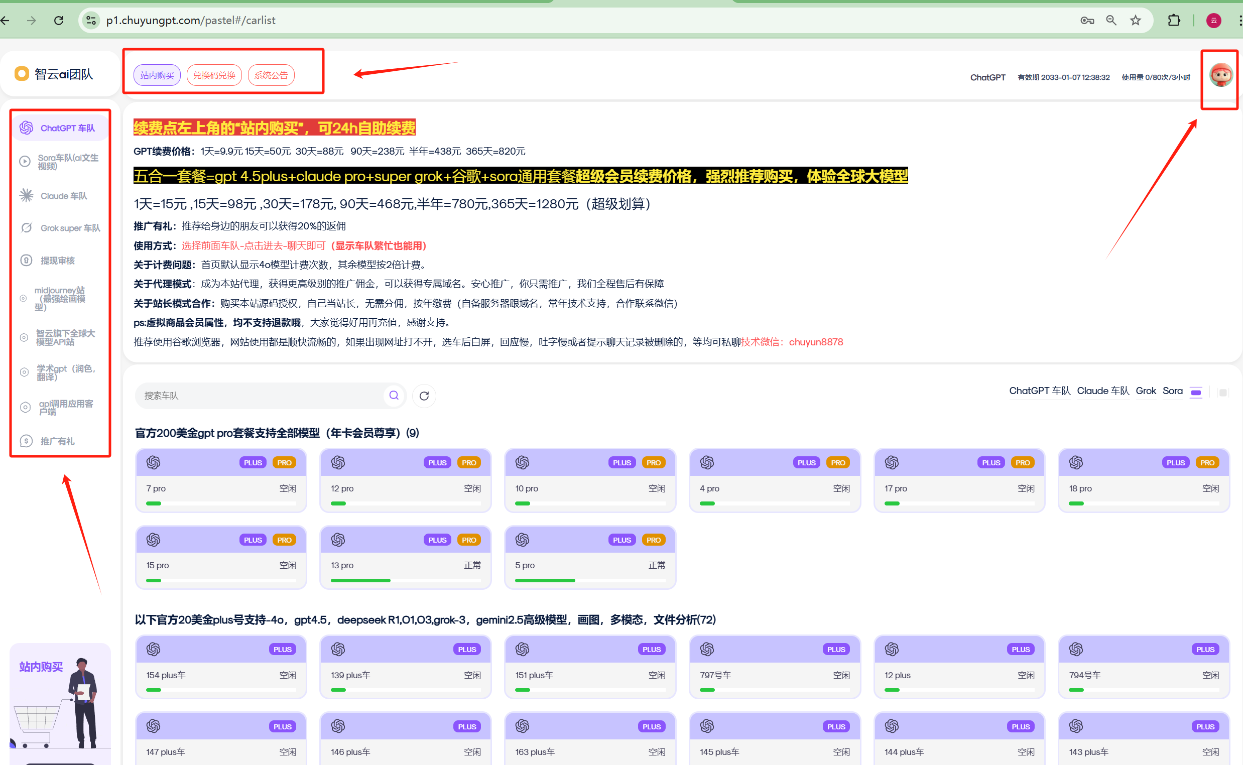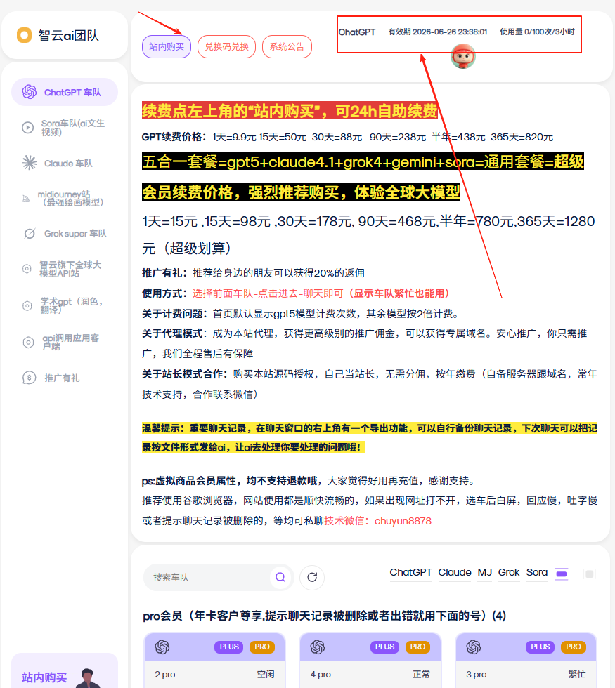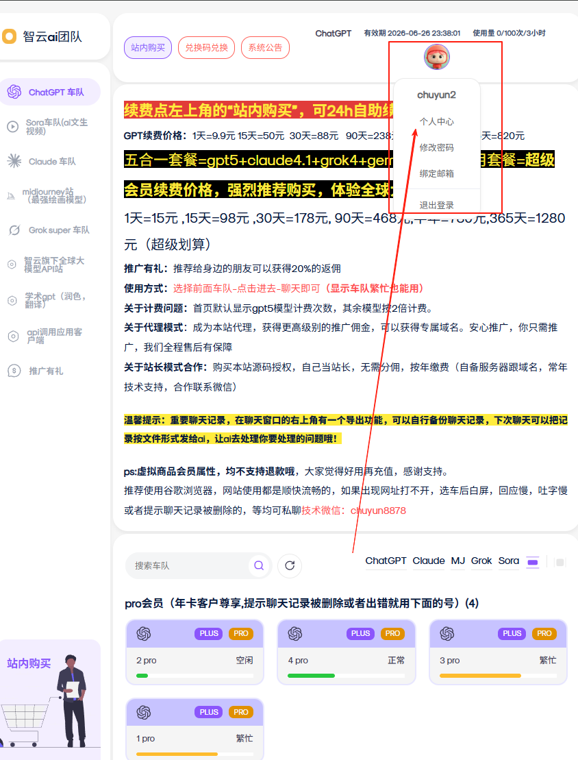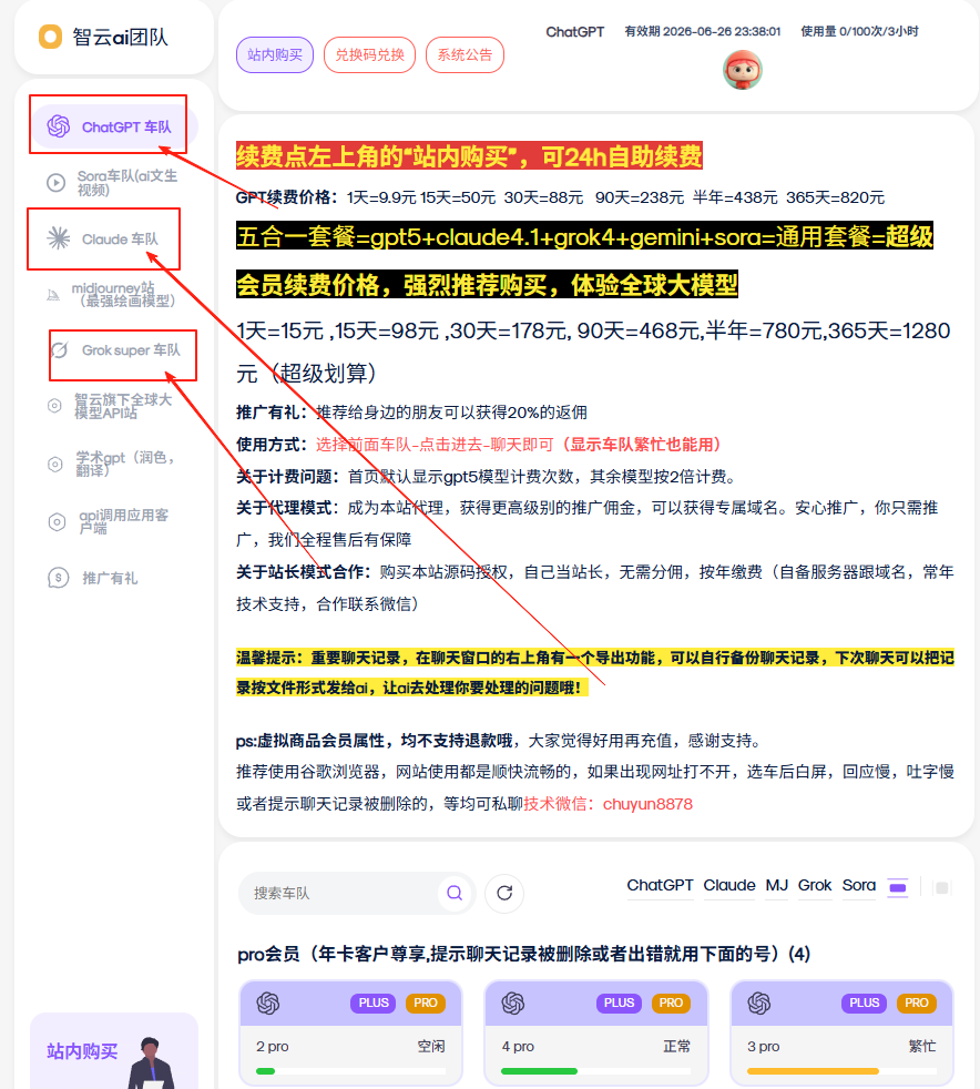## 因国内用户访问多,网址容易被墙,智云ai团队旗下所有网站更新都会放在这里!大家收藏我们这个网址!后期如遇不能往访问:查看本网址即可获最新网址。 ## ==智云团队ai会员===chatgpt plus会员+claude pro会员+super grok会员+sora +谷歌。一号通用全球最强大模型站。 # 自助下单: 网站是24小时都可以自助的,购买后不会用或者出错的联系微信chuyun8878 # **价格介绍** 年卡用户均送官方200美金的pro车队使用权益 ##### 单独GPT车队: 1天=9.9元 / 15天=50元 / 30天=88元 / 90天=238元 / 365天=820元(年卡超级划算) ##### 五合一(GPT+ Claude+ Grok+sora +gemini +deepseek)车队: 1天=15元 / 15天=98元 / 30天=178元 / 90天=468元 / 半年=780元 / 365天=1280元(年卡超级划算) ## 任意登录以下地址,哪个能打开用哪个,务必使用浏览器打开,微信是不能直接打开的,请务必知晓,推荐使用谷歌浏览器或者edg浏览器,打不开的联系微信指导 ### 推荐线路一:https://p4.zhiyunai168.com ### 推荐线路二:https://p1.chuyungpt.com ### 推荐线路三:https://p2.chuyungpt.com ### 海外专用线路“https://gpt4.zhiyunai168.com ### 全球通用线路:https://p6.chuyungpt.com ### 如果以上地址都打不开,或者回复出错,私聊微信客服chuyun8878获取1v1服务,根据您的地址适配最佳线路! # 一:已经有账号密码的,就直接登录就行,如下图  如果没有账号的就点左下角的点此注册,自己注册一个号,然后站内购买哦 **注册不成功或者不会注册的可以联系微信chuyun8878购买现成号** # 二:登录账号后就会进入下面这个界面,我大概说一下 ### 1.右上角是你的账号信息情况,点一下右上角你可以自助添加邮箱或者改密码或者退出账号都是在右上角的头像那边操作哦  ### 2.右上角头像的左边会显示你的到期时间和你的使用量  ### 3.左上角有站内购买和兑换码兑换和系统公告 ### 站内购买:俗称续费,你要增加使用时长就可以自助下单,时间会自动增加,兑换码:兑换码是我们人工发的,如果人工有给你兑换码,你可以点这里兑换 ### 3.左侧栏是不同的车队,车队代表原本镜像。1比1映射透传官方实时数据。  ### 4.mj,api站,学术GPT,api调用客户端都需要另外付费的,不会的话联系微信chuyun8878指导哦 5.推广有礼,普通用户推广有20%分成,有自己的推广渠道想要成为代理的可以联系微信chuyun8858开通代理权限,有要求,具体私聊微信哦  ### 三:点选车后,你就可以正常使用了,如果不会用的微信私聊我们 ### 1比1实时映射官方站。对话隔离,保证映射,国内线路直接用! (支持图片绘画画图、识图、图片分析、文件上传、文件分析,语音、论文写作、代码生成多模态功能,数据分析,代码解释器,gpts商店等等) ### 1.模型选择:  ### 2.图片,文件分析,上传。  ### 3.gpt工具选择:   ### 功能演示: ### 代理模式功能演示,chatgpt智能体功能  ### 深度研究  ### 创建图片  ### 研究与学习  ### 网页搜索  ### 画布  ### 如果你对我们网站有改进建议或者有好想法的,想在ai时代分一杯羹,都欢迎联系我们微信进行交流,尽我们所能给大家提供你们需要的帮助哦 ### 用户与 ChatGPT 在界面上的对话,内容是如何将邮件改写得更友好且专业。总结会议。发现新见解。提高效率。用户与 ChatGPT 在界面上的对话,内容是总结会议记录。  ### 生成和调试代码。自动执行重复性任务。学习新 API。  ### 学习新知识。潜心研究兴趣爱好。回答复杂问题  ### 搜索网络点击网络搜索图标,即可通过相关网络资源的链接获得快速、及时的答案。  ### 协同写作和编码利用画布功能,您可以使用 ChatGPT 处理需要编辑和修改的项目。  ### 分析数据并创建图表上传文件,让 ChatGPT 帮助分析数据、总结信息或创建图表。  ### 讨论图片拍摄或上传图片,然后向 ChatGPT 提问。  ### 最后说一下关于智云团队的其他套餐,有需要其他的可以打开这个链接看下https://mrdoc.zhiyungpt.com/doc/71/