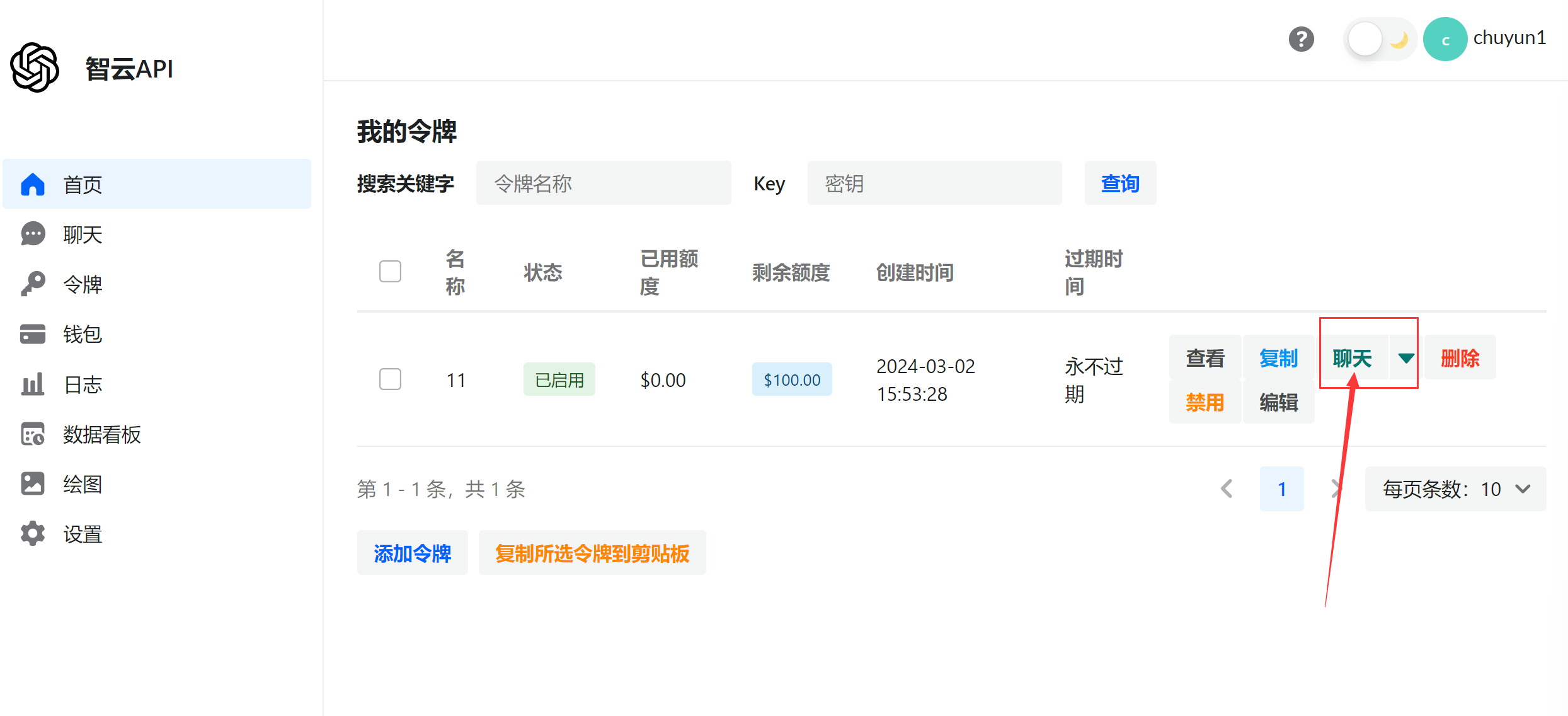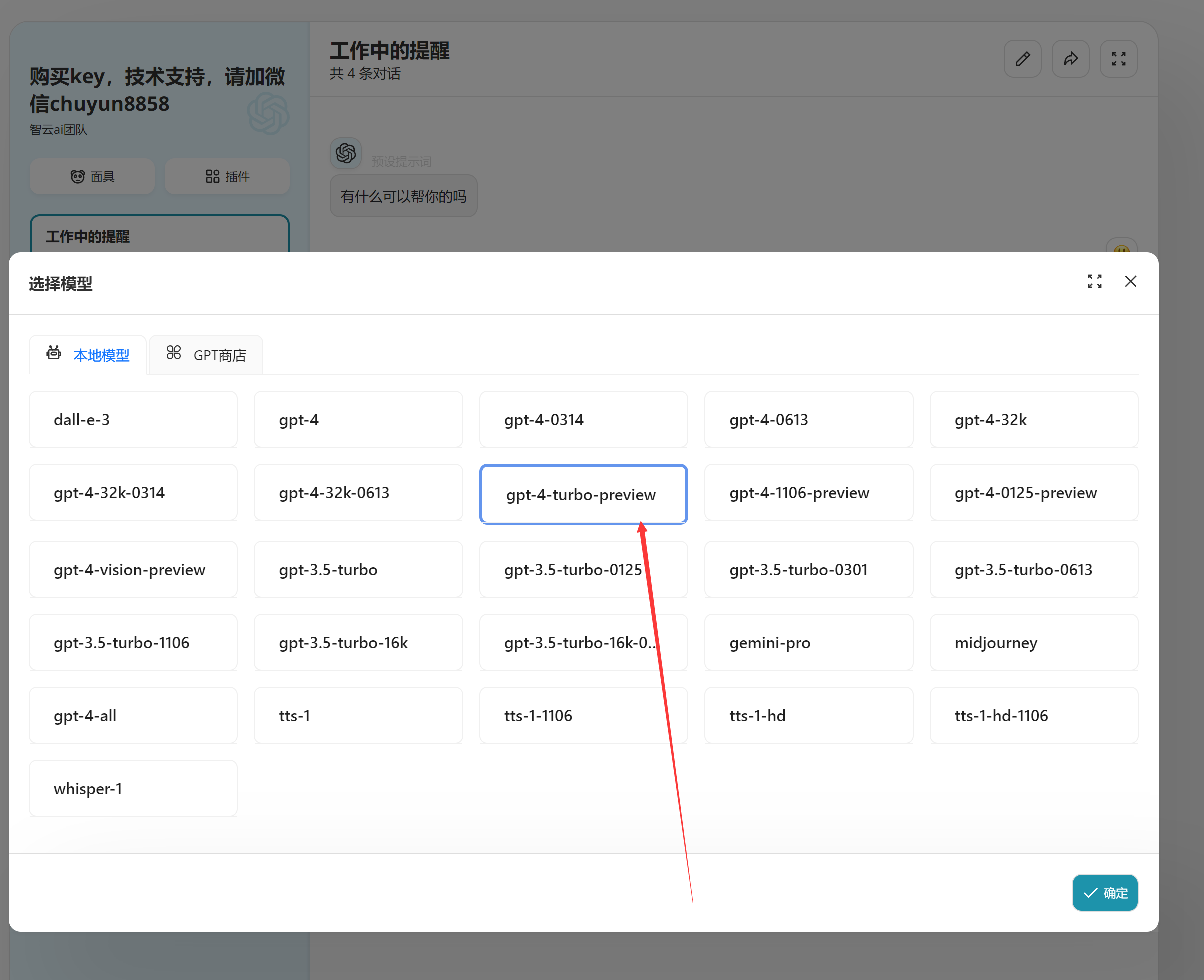 第一步:打开https://api.zhiyunai168.com/  第二步:输入注册信息,如下图:  第三步:登录你刚才注册的账号:  第四步:联系客服购买充值,或者自助充值: 开始使用: 第五步:创建令牌:   第六步:   第7步:  第8步:选择自己需要的模型使用:也可以自己选择gpt-4-turbo-preview模型指向最新官方的大模型。  第9步,开始提问;  模型选择:  ## 功能介绍: ## 1:支持全模型调用:   绘画模型调用:    ## ps:自己有令牌后,也可以通过: https://chat.zhiyunai168.com/直接访问使用:配置教程如下: